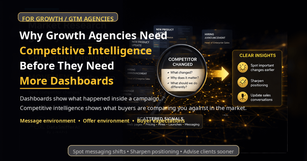 Not as a replacement for agency strategy. And not as another noisy monitoring system that floods teams with updates they do not need. The practical goal is simpler than that: help growth and GTM agencies surface meaningful competitor shifts faster, so they can interpret what changed and respond with clearer strategy.